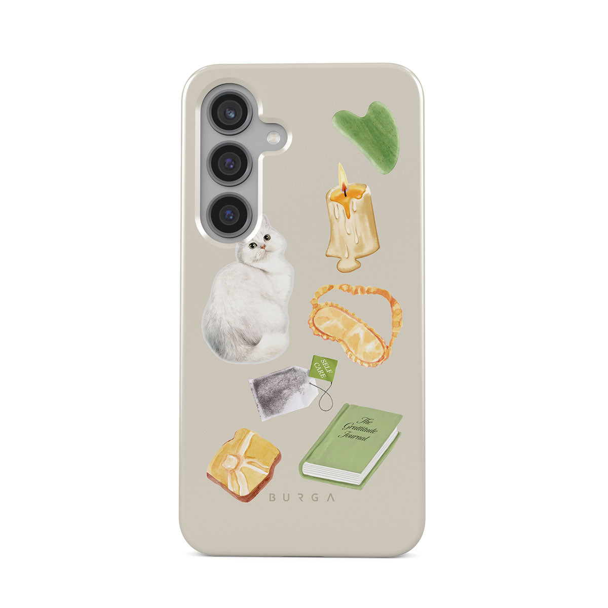 This design features: white cat, green book, candle, Gua Sha bar, sleeping mask, tea bag, yellow crystal