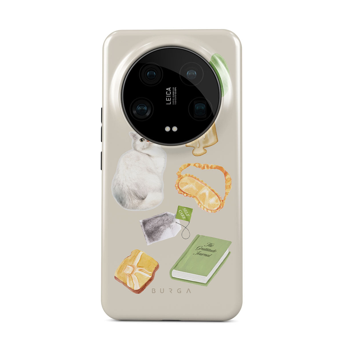 This design features: white cat, green book, candle, Gua Sha bar, sleeping mask, tea bag, yellow crystal