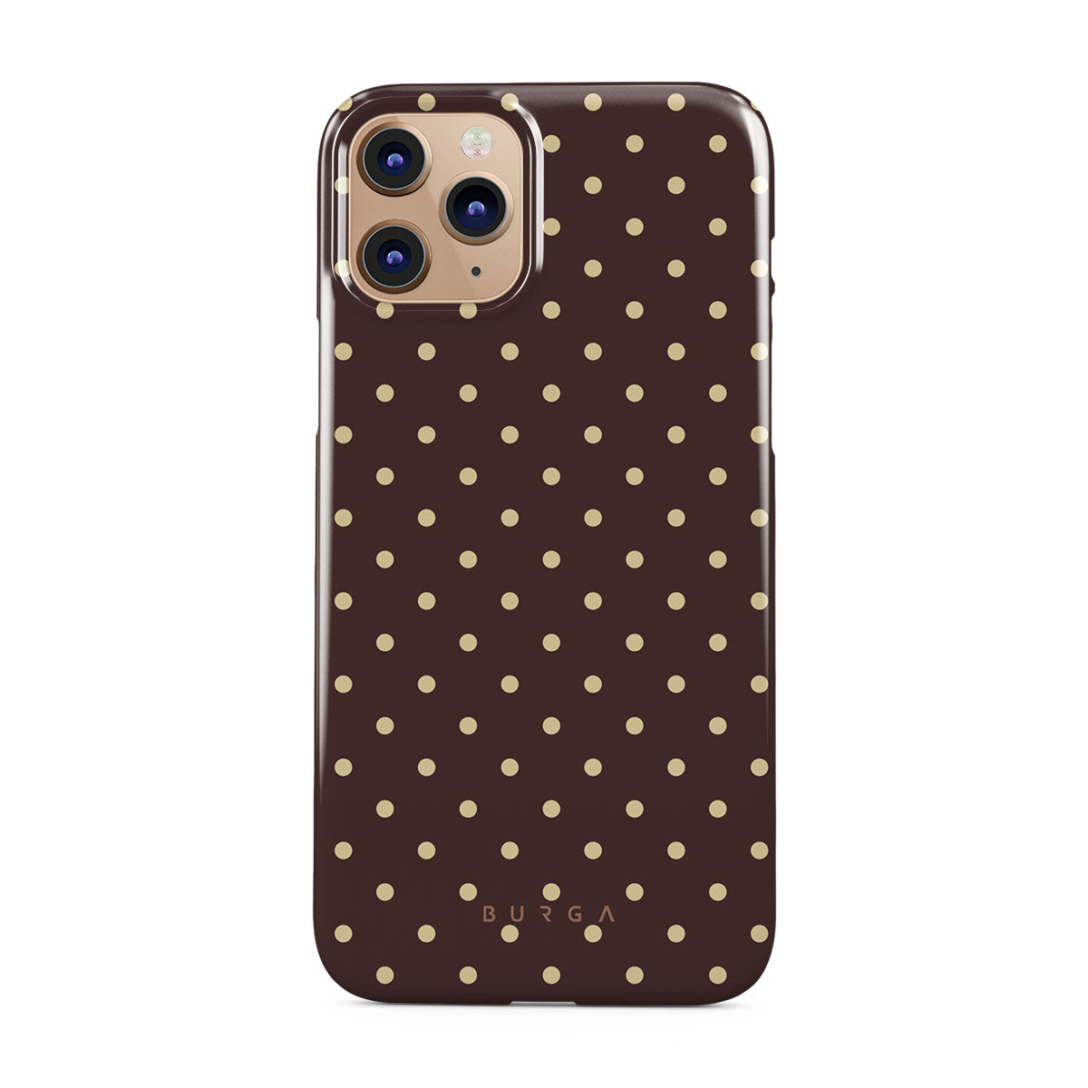 Playful yet polished, our Sorry Busy iPhone 11 Pro phone case design features a warm brown background sprinkled with delicate beige polka dots, blending charm with a professional edge. It's for those who keep it stylish, even when fully booked and thriving.