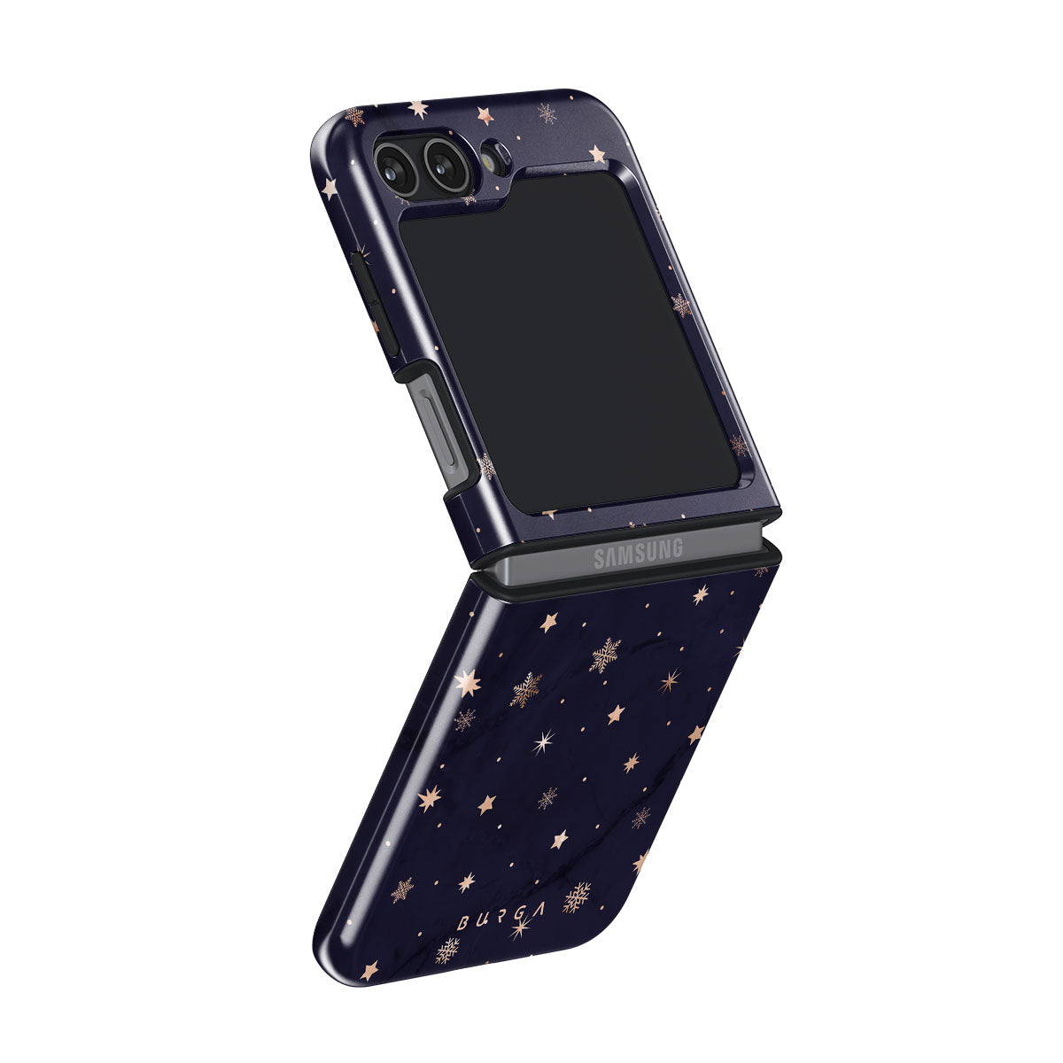With a dreamy combination of dark blue and golden colors in the pretty star pattern found in our Midnight Kiss Samsung Galaxy Z Flip 5 phone case, you can protect your phone and add a magical feel to it just in one go.