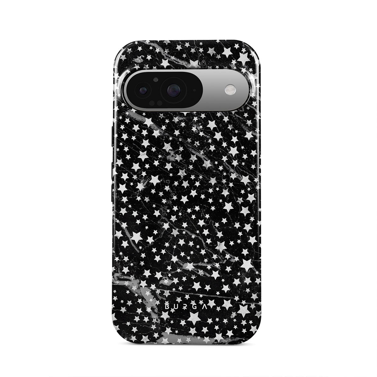 Google Pixel 9 phone case is inspired by the sky above us. Here the charming star pattern meets with a trendy black and white marble. Add the unique combination to your wardrobe and transform your protective phone case into a fashion accessory.