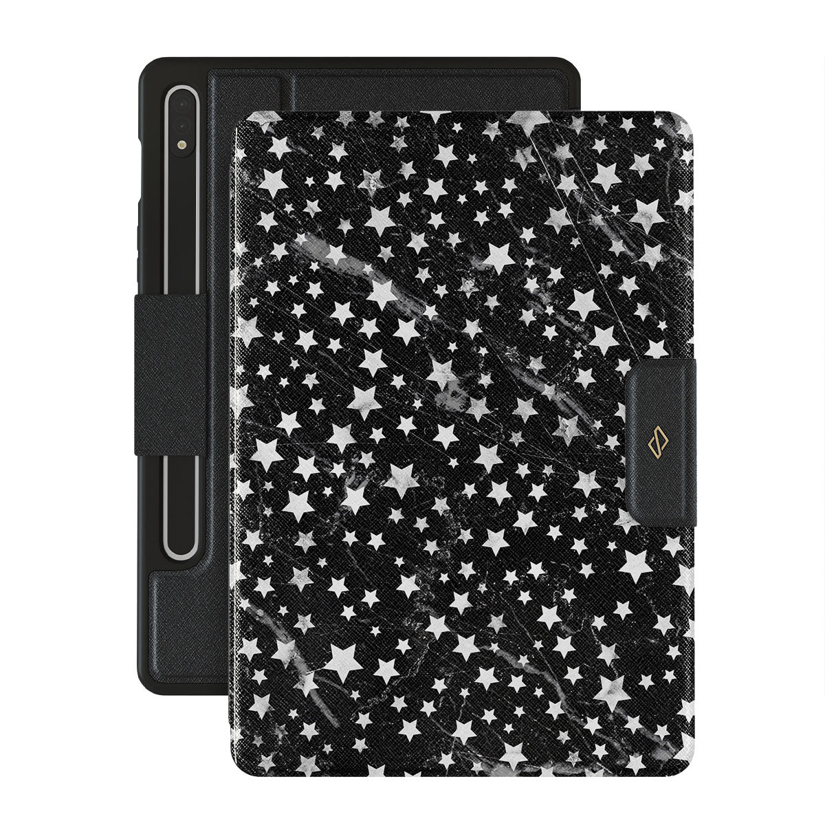 Dark, endless with flickering stars, the Starry Night Samsung Galaxy Tab S9 FE folio case is inspired by the sky above us. Here the charming star pattern meets with a trendy black and white marble. Add the unique combination to your wardrobe and transform your protective Galaxy Tab case cover into a fashion accessory.