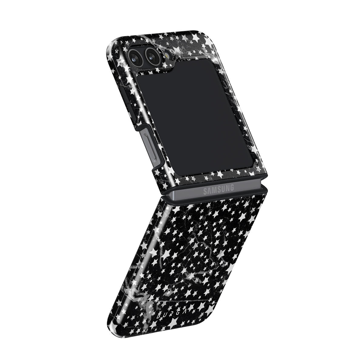 Samsung Galaxy Z Flip 5 phone case is inspired by the sky above us. Here the charming star pattern meets with a trendy black and white marble. Add the unique combination to your wardrobe and transform your protective phone case into a fashion accessory.