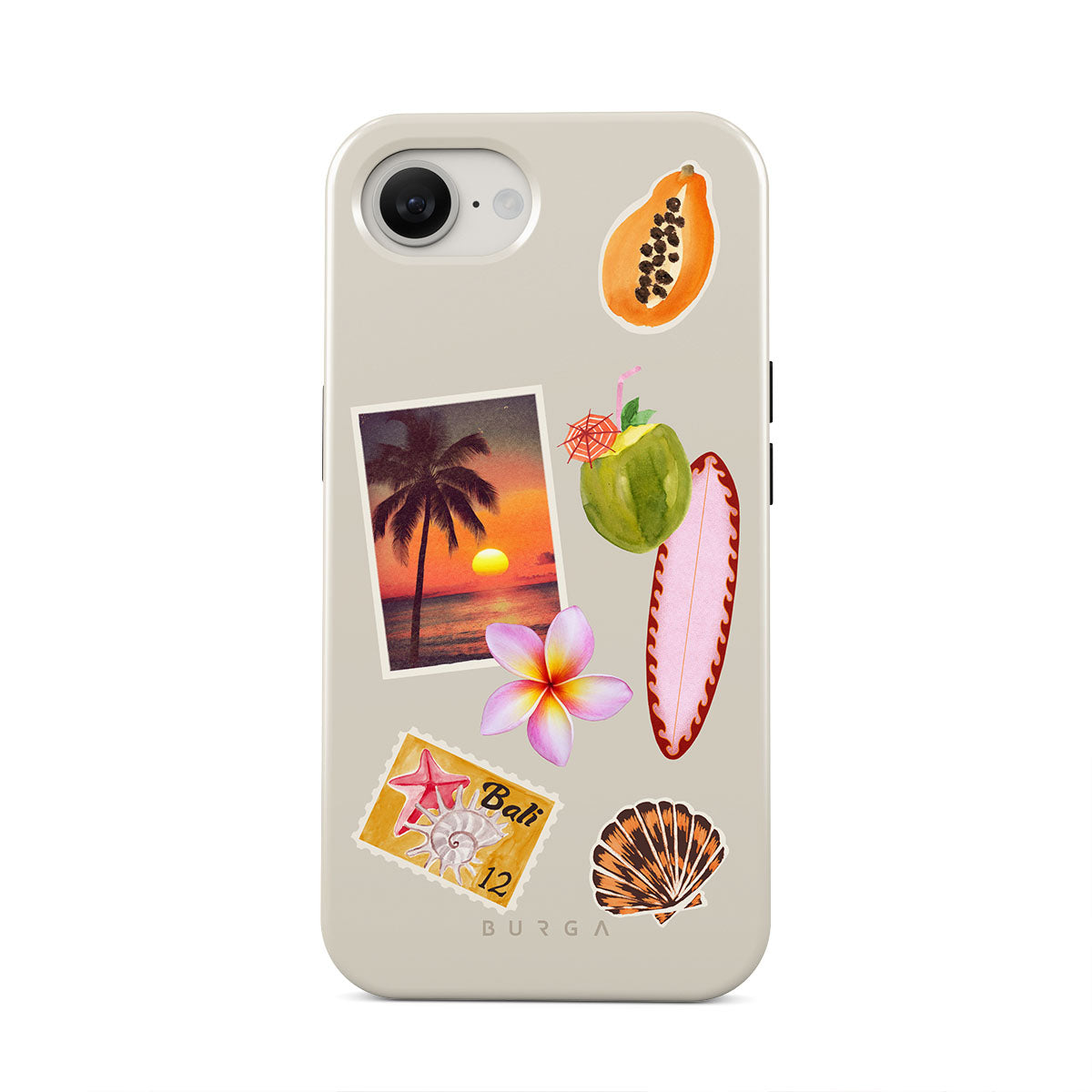 This design features: tropical sunset photo, papaya, green coconut, pink surfboard, pink plumeria flower, orange shell, Bali postcard