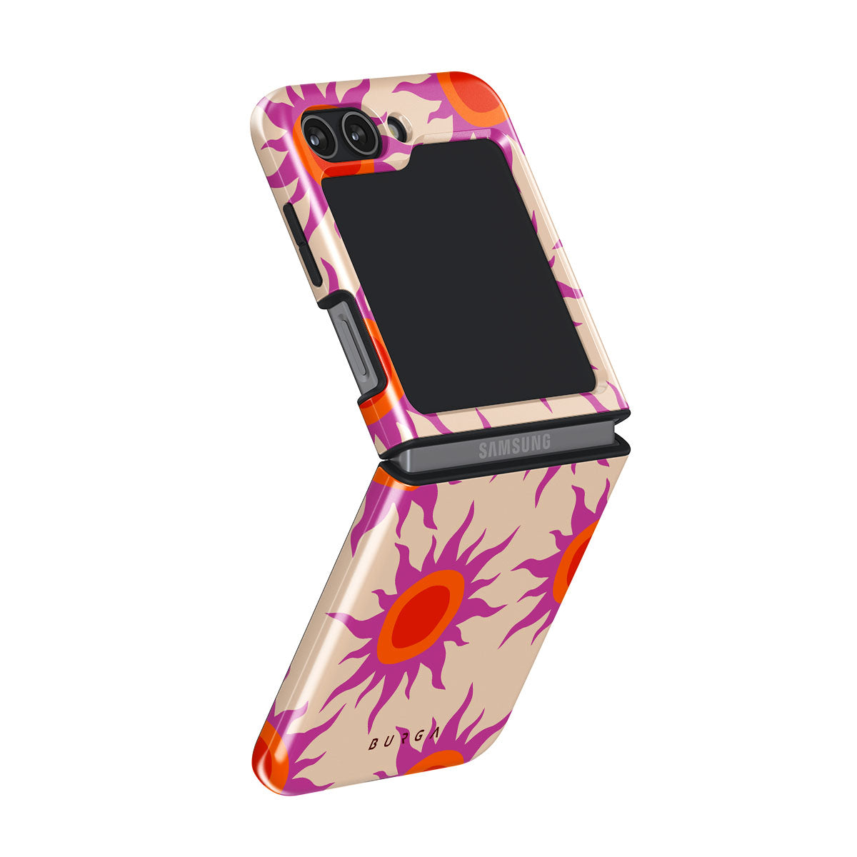 Discover the radiant serenity of the Sunset Glow design, a harmonious blend of soothing pastels and fiery suns. Vivacious viva magenta rays add a playful touch, perfectly balancing tranquility and dynamism. More than just a fashion accessory, this striking Samsung Galaxy Z Flip 5 phone case mirrors your unique personality and zest for life.