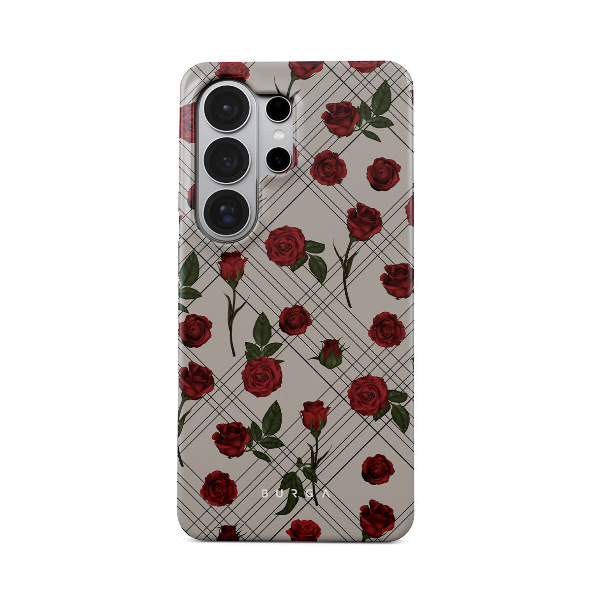 Embrace the subtle rebellion of our Sweet Sin Samsung Galaxy S26 Ultra phone case design. On a muted nude-gray canvas, scattered small red roses hint at passions hidden beneath the surface. A design that balances the delicate with the daring. Crafted for those who find beauty in the unexpected and wear their edge with elegance.