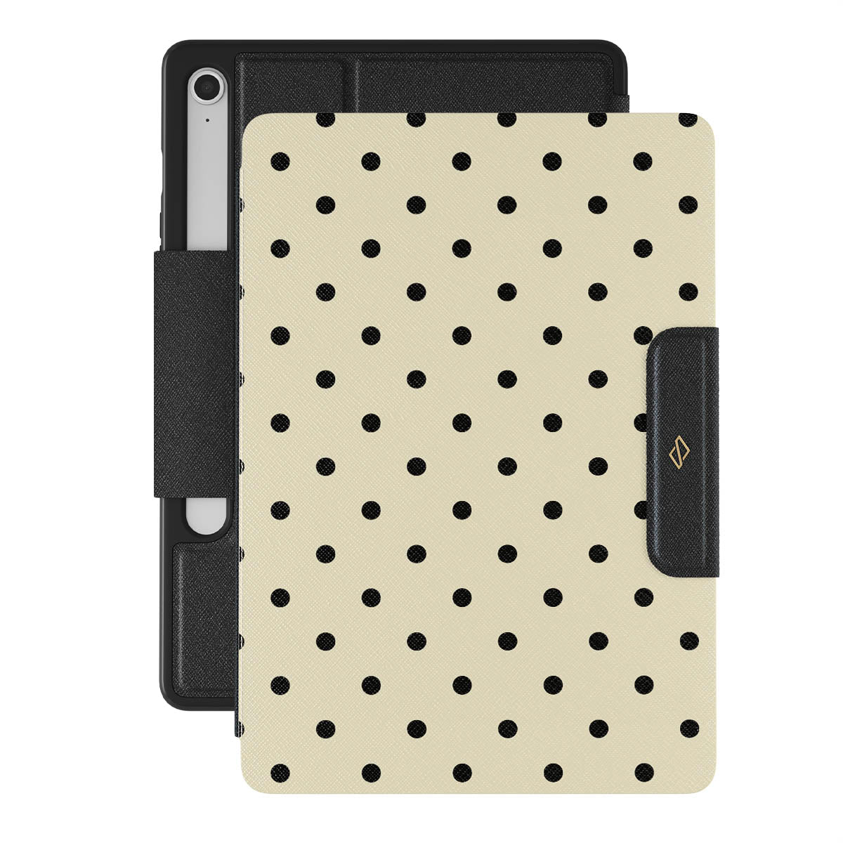 This design features: beige background with small black polka dots.