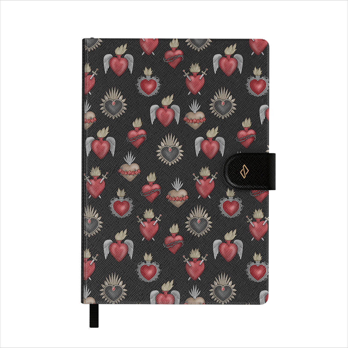 Features well-detailed BURGA patterns to a vegan faux leather front cover. Topped with an elegant black ribbon page marker.