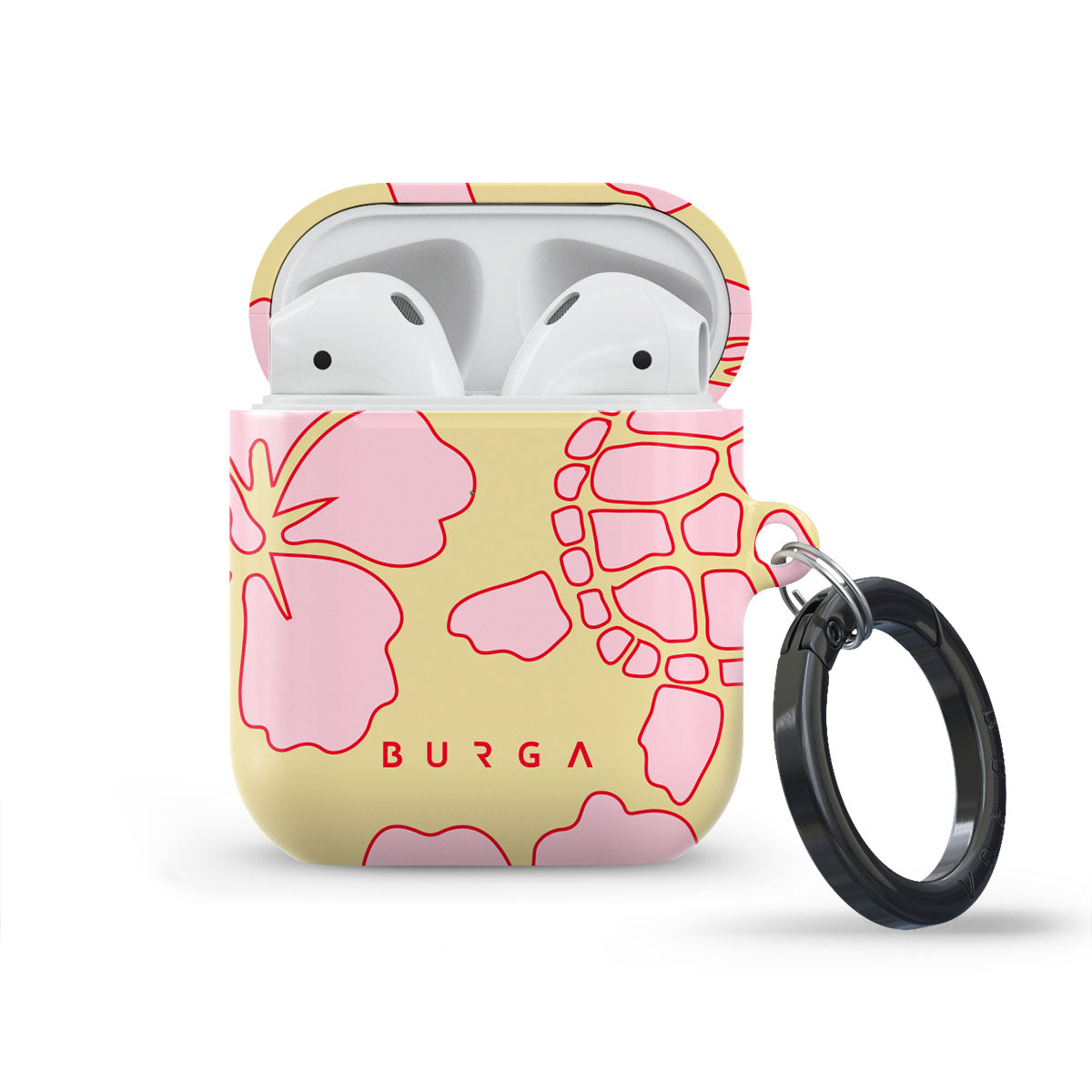 The Tan Break Apple Airpod Generation 1 & 2 case cover features a vibrant design with pink flowers and sea turtles on a sunny yellow background. This tropical-inspired pattern exudes a laid-back, beachy vibe, perfect for those who love vibrant and nature-themed aesthetics.