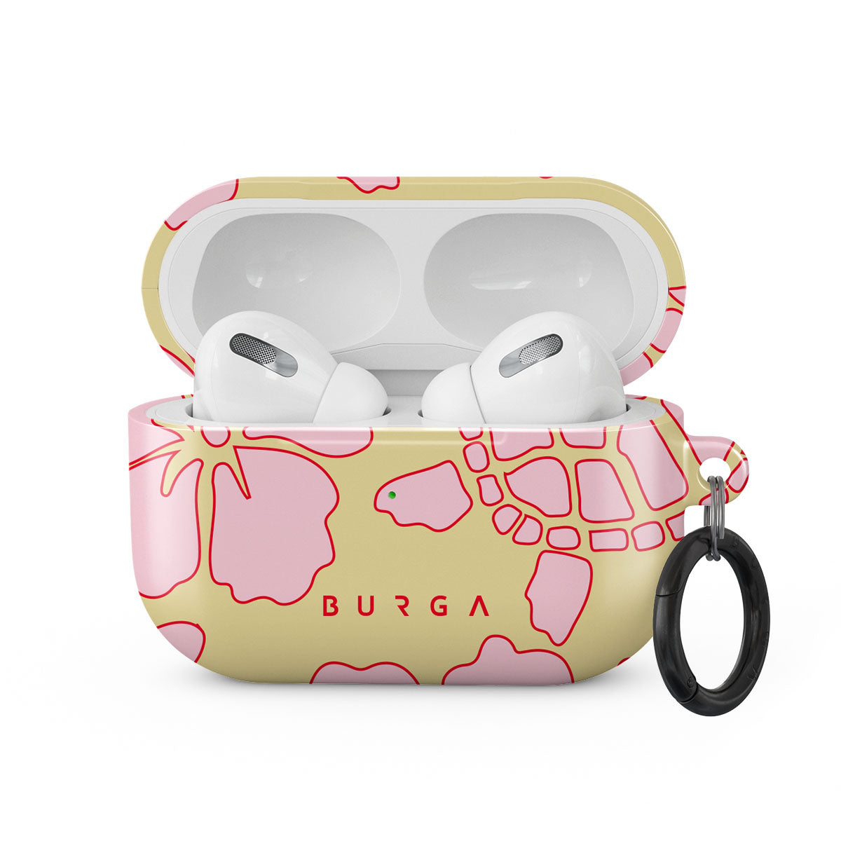 The Tan Break Apple AirPods Pro case cover features a vibrant design with pink flowers and sea turtles on a sunny yellow background. This tropical-inspired pattern exudes a laid-back, beachy vibe, perfect for those who love vibrant and nature-themed aesthetics.