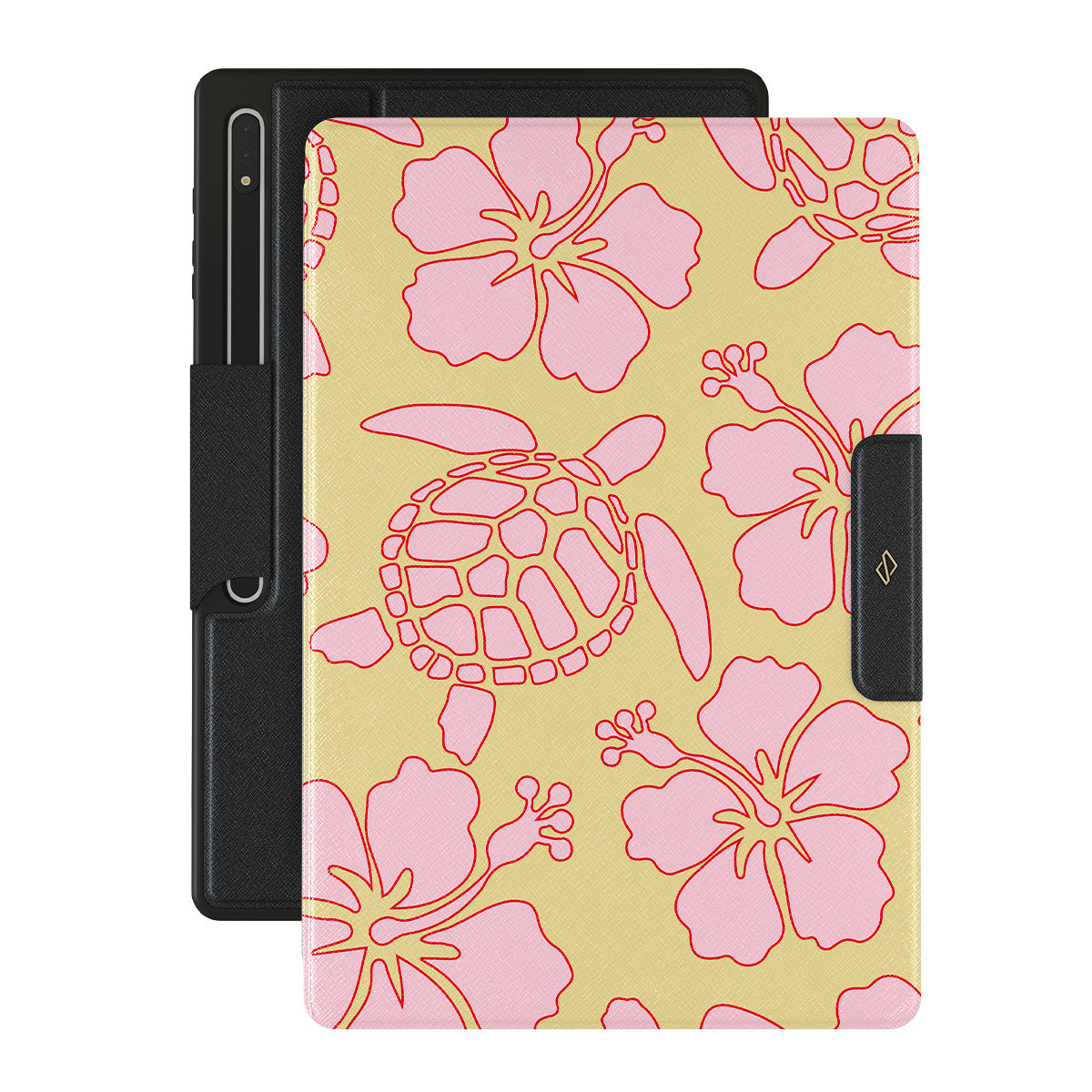 The Tan Break Samsung Galaxy Tab S9 Ultra folio case features a vibrant design with pink flowers and sea turtles on a sunny yellow background. This tropical-inspired pattern exudes a laid-back, beachy vibe, perfect for those who love vibrant and nature-themed aesthetics.