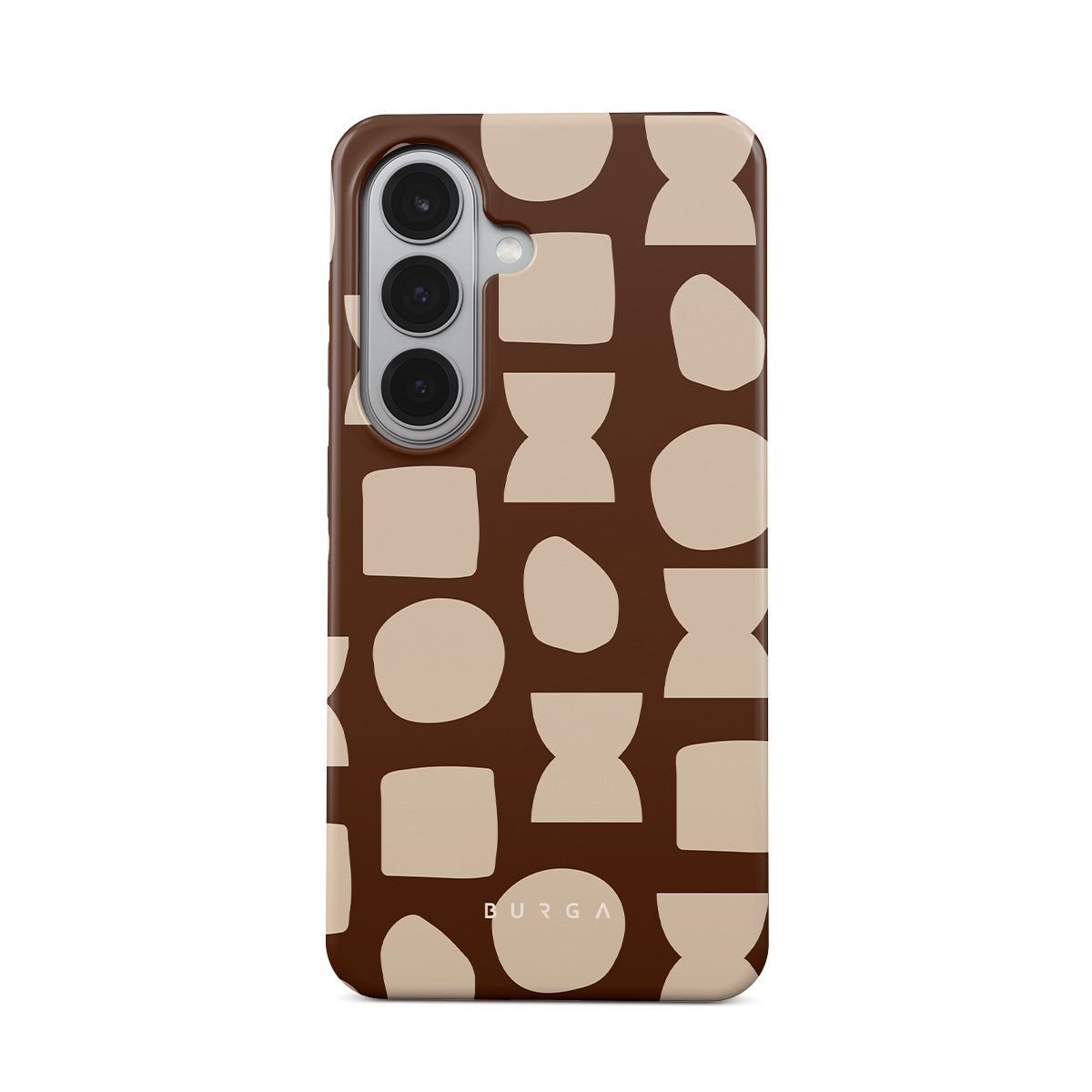 Our Terracotta Samsung Galaxy S26 Plus phone case design whispers warmth and grounded energy. Against a rich brown background, an interplay of light shapes unfolds, captivating the eye with an array of circles, squares, and hourglasses. Each shape is a testament to the beauty found in simplicity.