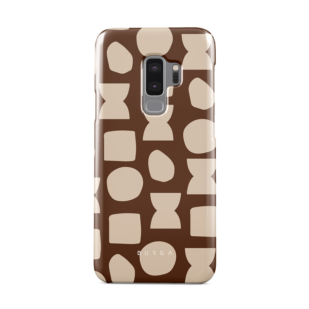 Our Terracotta Samsung Galaxy S9 Plus phone case design whispers warmth and grounded energy. Against a rich brown background, an interplay of light shapes unfolds, captivating the eye with an array of circles, squares, and hourglasses. Each shape is a testament to the beauty found in simplicity.