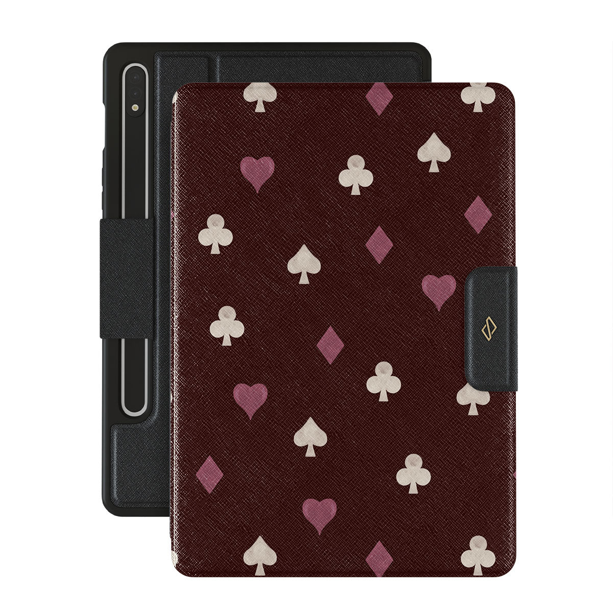 Nothing is as it appears. Hearts, clubs, diamonds, and spades—stacked in your favor or playing against you? This Samsung Galaxy Tab S8/S7 folio case design features a rich burgundy background and minimalist suits that make for a game where the rules are constantly shifting.