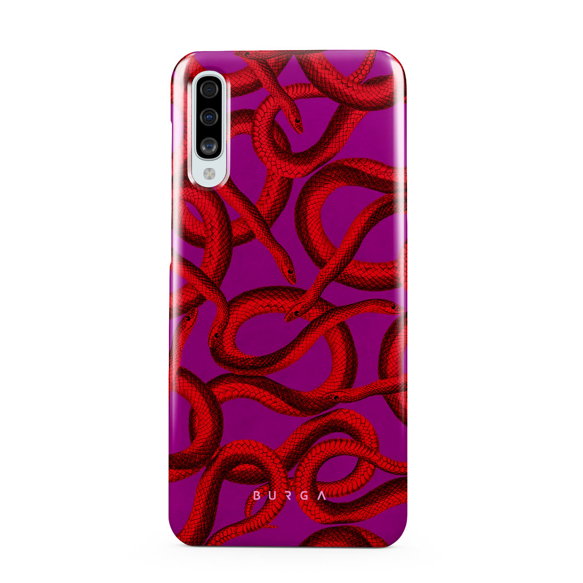 Watch Out Samsung Galaxy A50 phone case design offers a fierce feel with a bright magenta colored background covered in red snakes pattern. Make a statement while protecting your phone, as this case is guaranteed to catch everyone's eye.