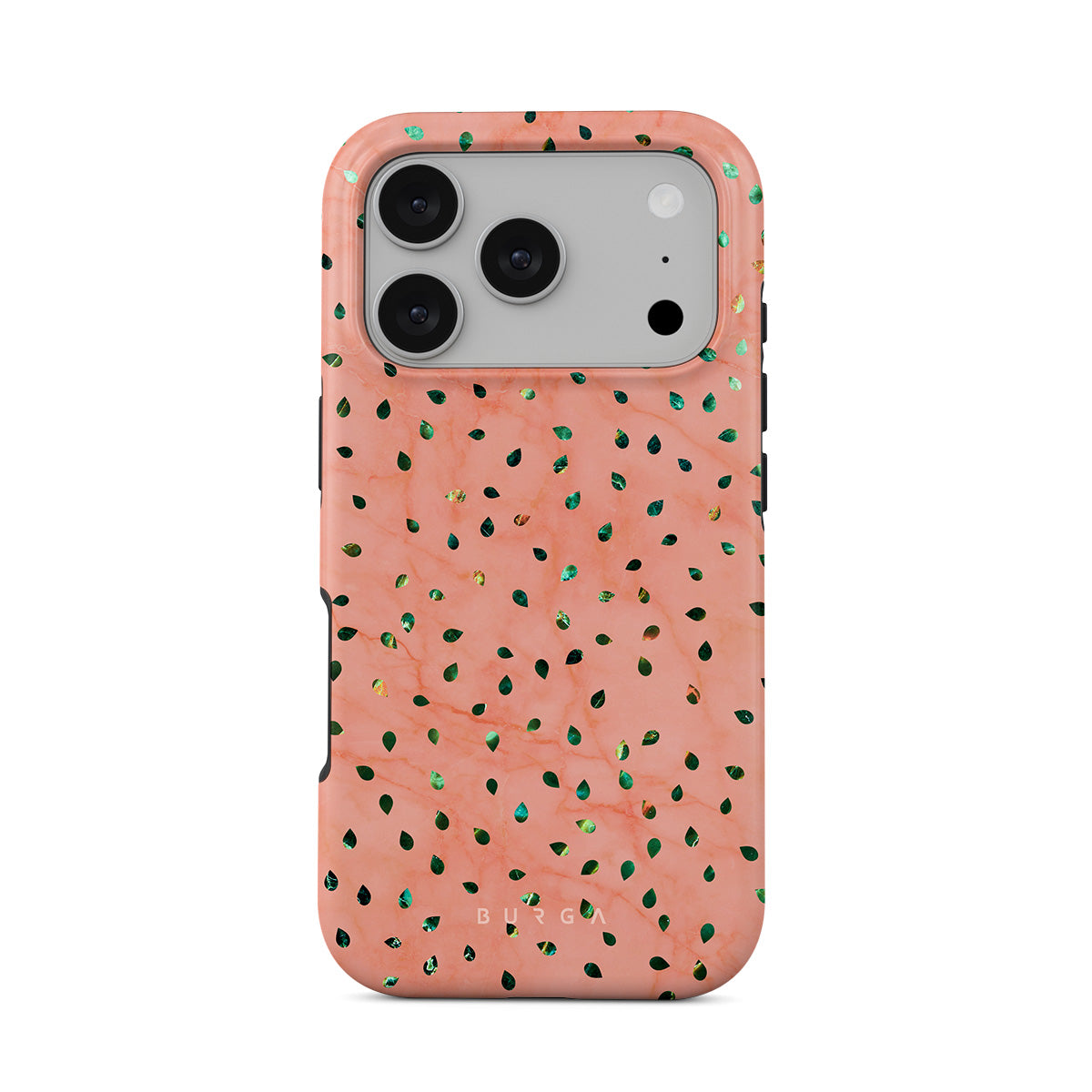 The Watermelon Shake iPhone 17 Pro phone case offers a playful take on design merging. The watermelon seed-like specks showcase striking tropical design fragments that add a splash of color to the fresh and breezy coral pink marble. This way, the funny protective phone cover becomes a perfect statement piece for your summer outfits.