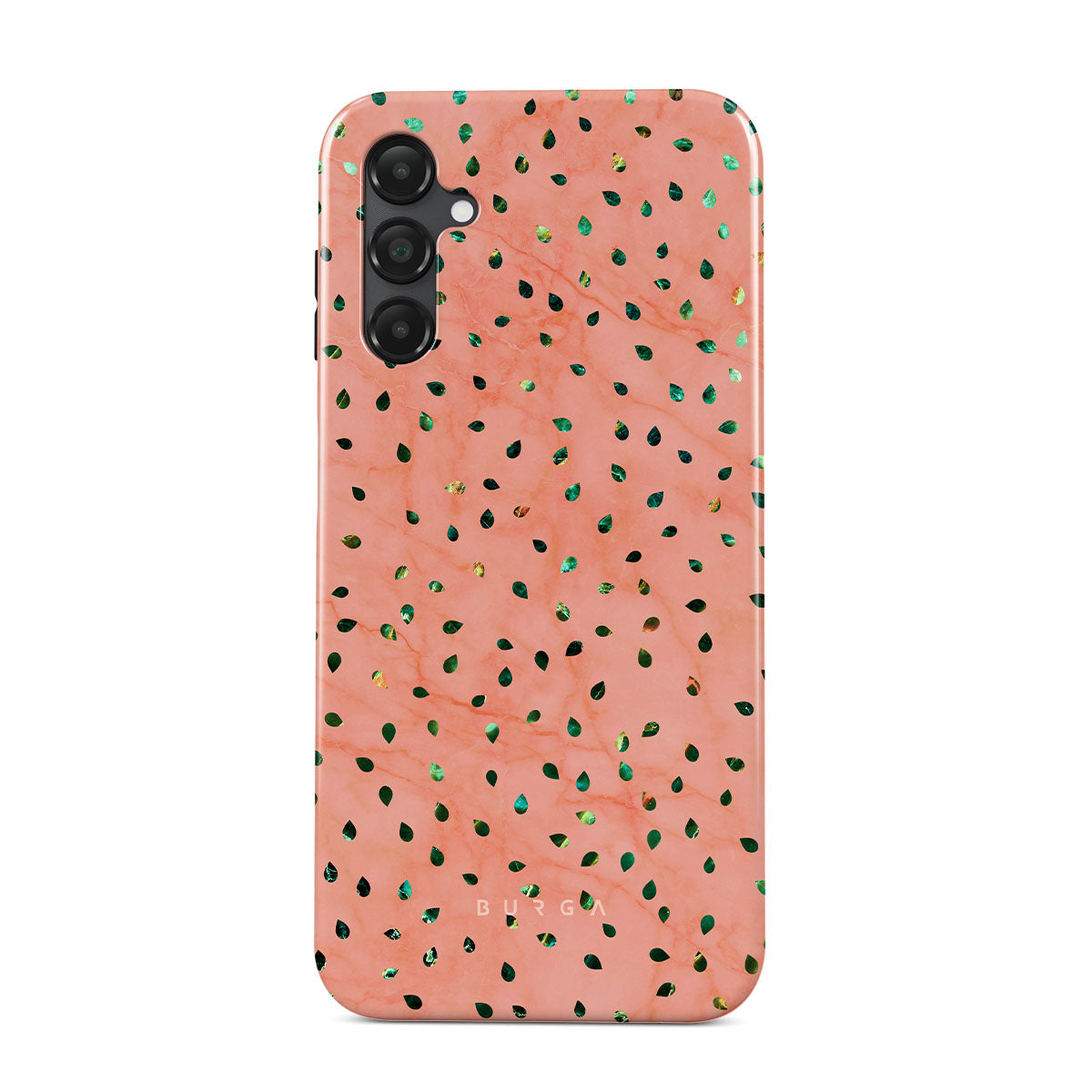 The Watermelon Shake Samsung Galaxy A25 phone case offers a playful take on design merging. The watermelon seed-like specks showcase striking tropical design fragments that add a splash of color to the fresh and breezy coral pink marble. This way, the funny protective phone cover becomes a perfect statement piece for your summer outfits.