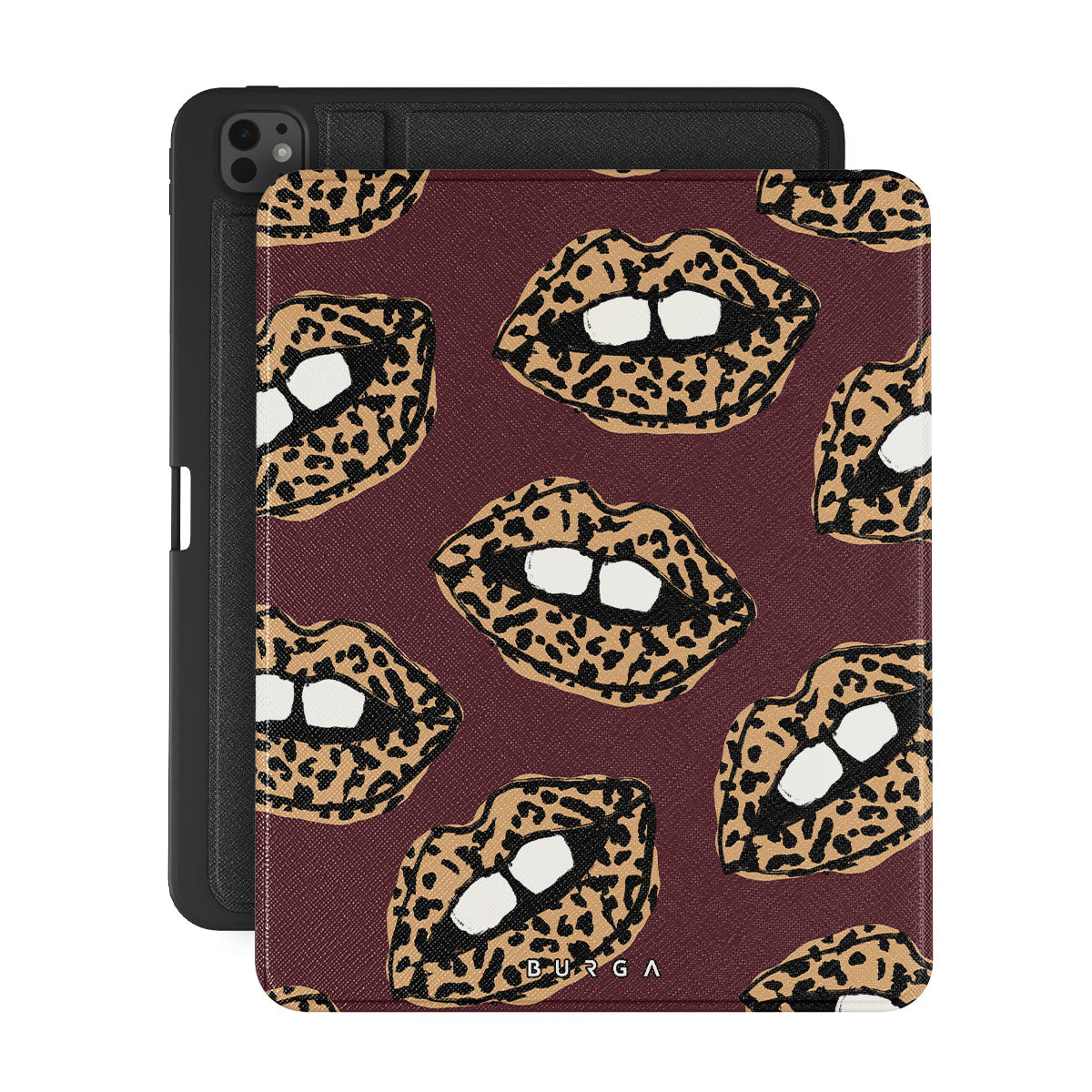 This design features: leopard print, lips, open lips, colored lips