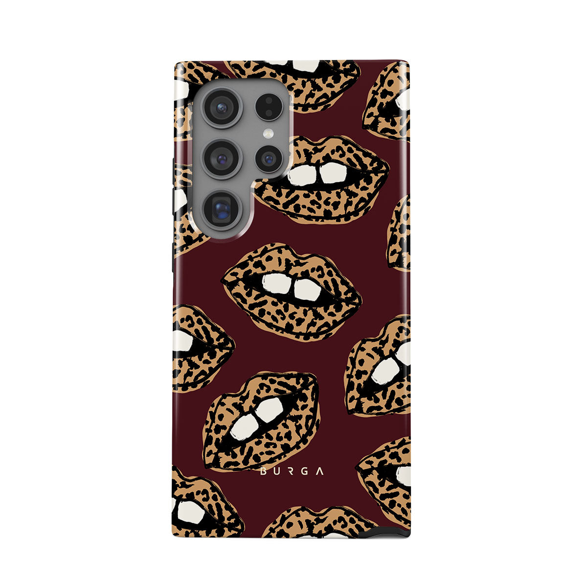 This design features: leopard print, lips, open lips, colored lips