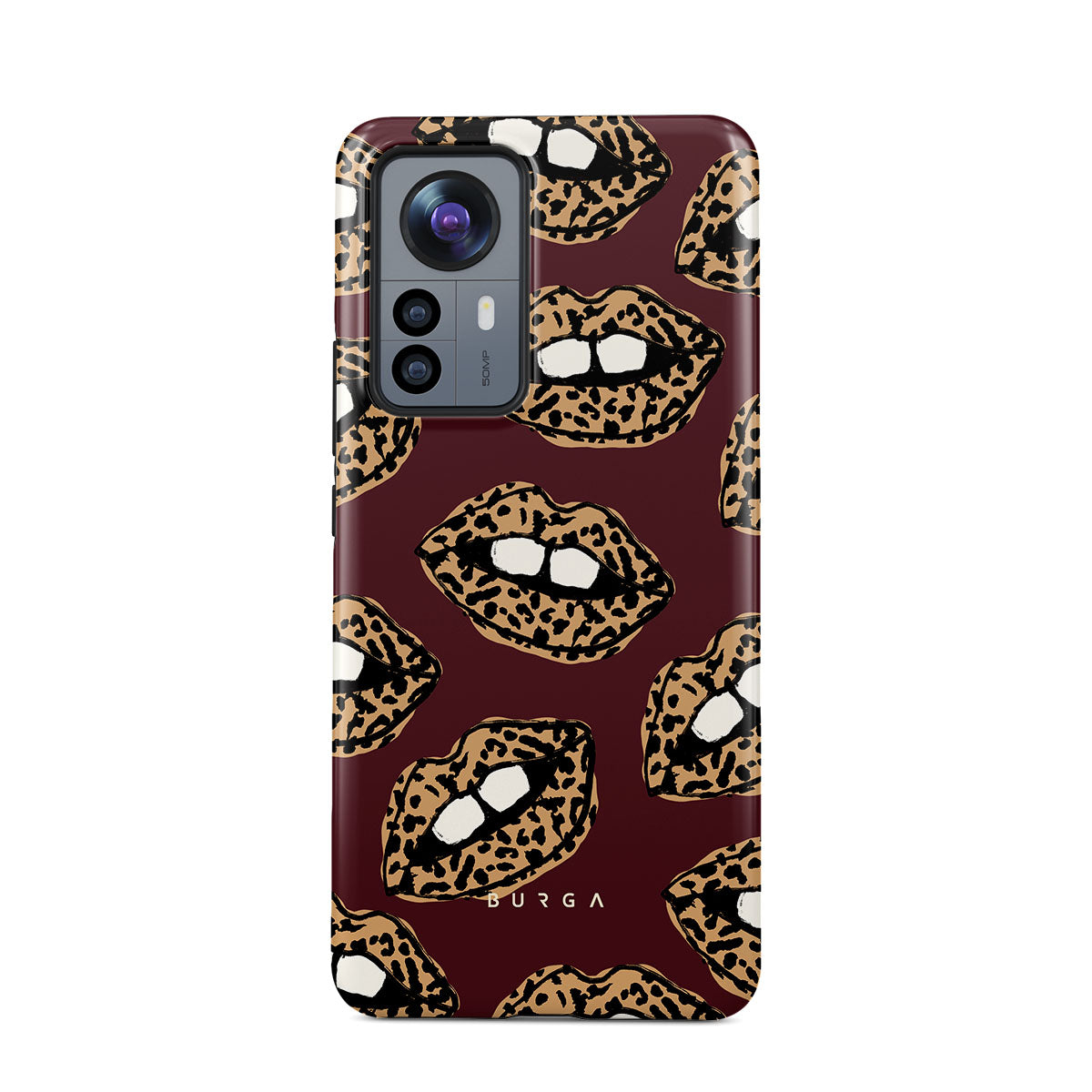 This design features: leopard print, lips, open lips, colored lips